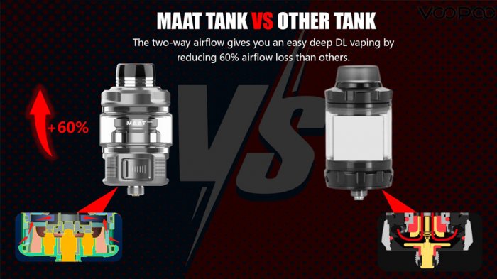 Clearomizer MAAT TANK s klasickým 510 závitem je inovativní clearomizer od společnosti VOOPOO, který umožní snadné a hluboké DL vapování. Využívá systém horního plnění - po odšroubování vrchní části plníte liquid otvorem přímo do těla clearomizeru o objemu 6,5ml. V základním balení budete mít na výběr dvě žhavící hlavy, a to TPP-DM2 o odporu 0,2ohm a TPP-DM3 o odporu 0,15ohm. Inovativní regulace přívodu vzduchu zajistí širokou škálu nastavení tuhosti potahu od čistého MTL až po utažený RDL.